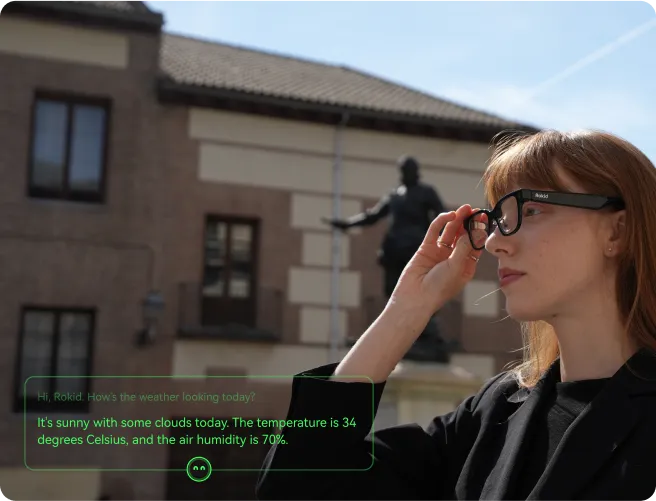 Just say "Hi Rokid" to start a conversation with your AI assistant. You can ask questions, take a photo to identify what you’re seeing, and even follow up with more questions.